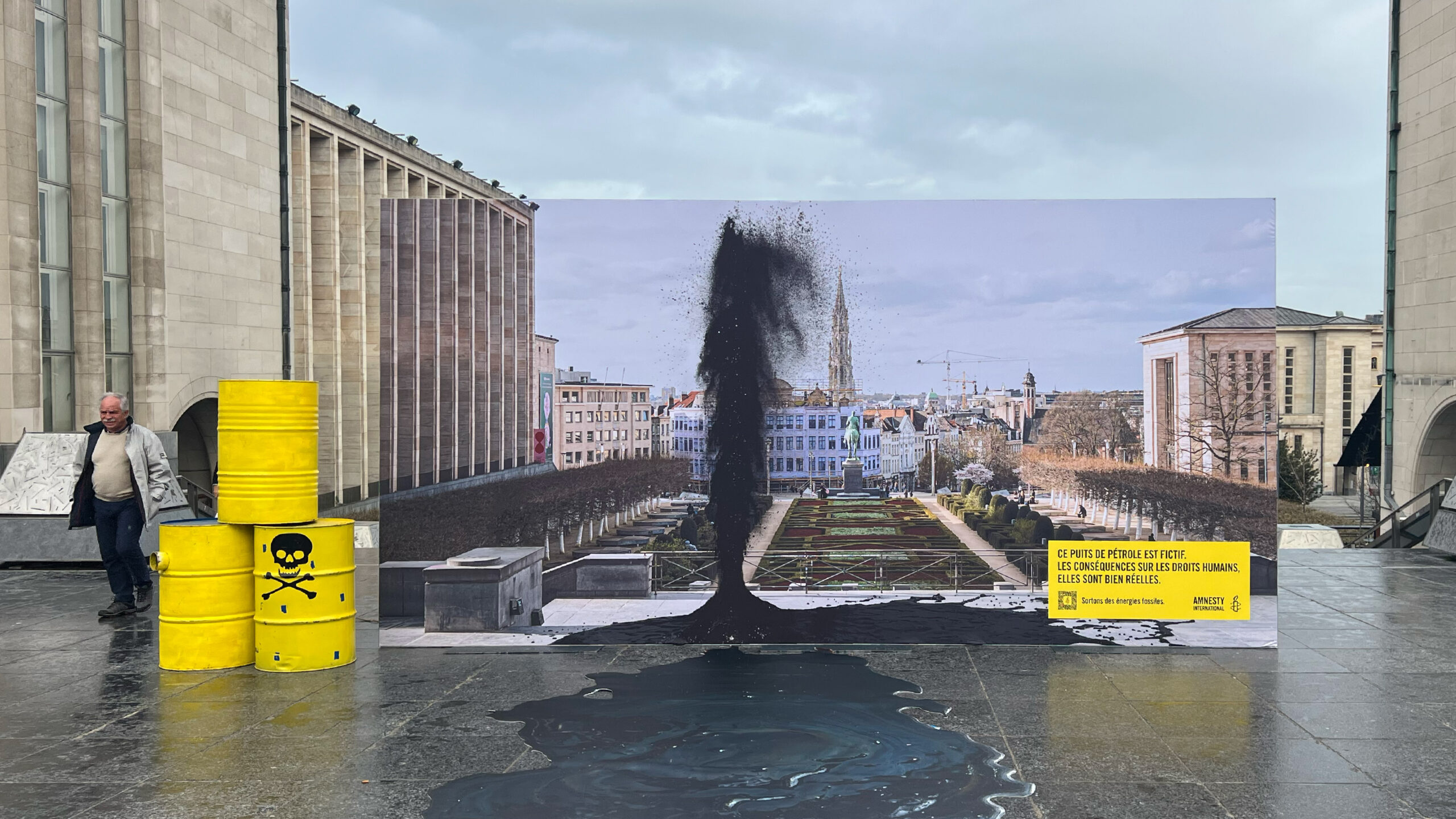 À l’aide d’un trompe-l’œil géant, nous mettons en scène une fuite de pétrole au milieu de Bruxelles. Des flaques au sol, des figurant·es malades et des barils. Tout y est pour faire passer le message: ce puits de pétrole est fictif mais les conséquences sur les droits humains sont bien réelles. Sortons des énergies fossiles.